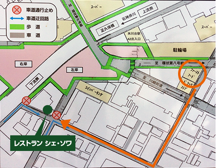 ファーストフードから入り2つ目の十字路を右折、通行止め前で 誘導係の方にお店の駐車場の利用をお伝え下さい。